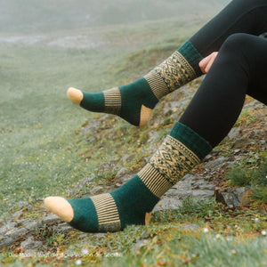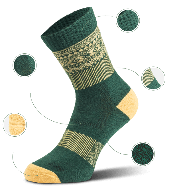 Jede Socke hat ein einzigartiges dekoratives Band mit nordischen Mustern, das den Knöchel umgibt. Die erdigen Schattierungen von Dunkelgrün und Dunkelblau schaffen einen angenehmen Kontrast zu Beige und Hellgelb. Sie sehen toll in Stiefeln, Laufschuhen und sogar in Anzugschuhen aus.